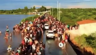 Barragem transborda, alaga rodovia e vira local de festa, veja: