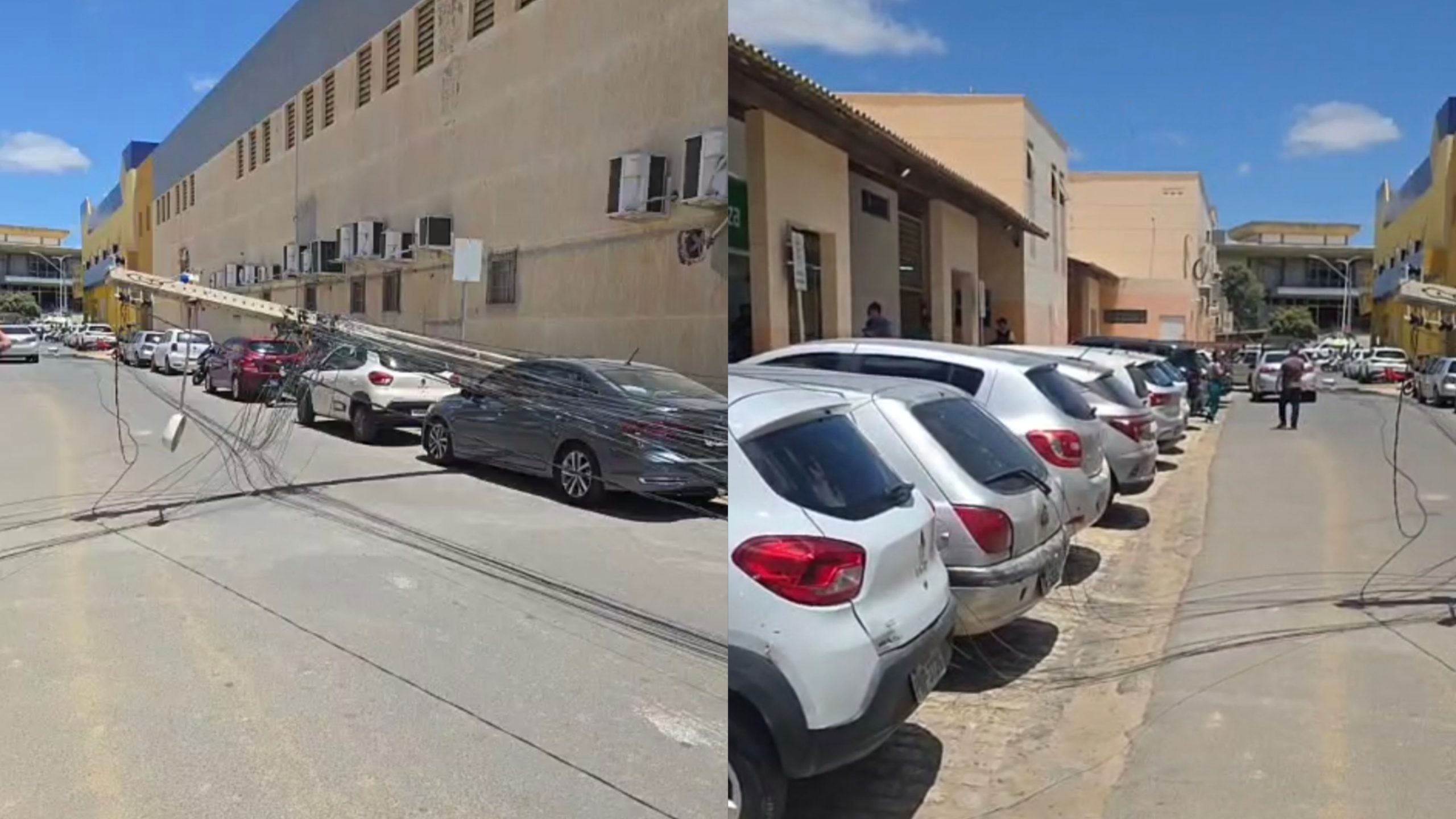 Na manhã desta sexta-feira (3) um poste caiu e a fiação ficou em cima de veículos ao lado do Shopping Águas Center, em Juazeiro.