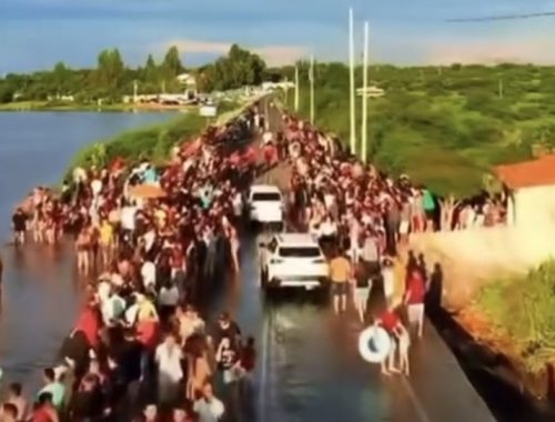 Barragem transborda, alaga rodovia e vira local de festa, veja: